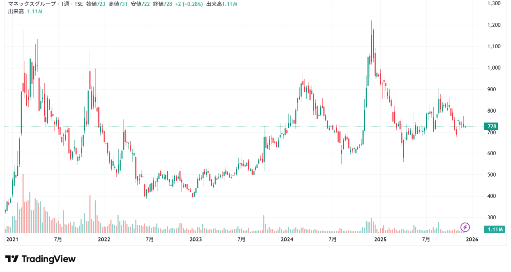 現在は700円台で推移しており、大きな変動の波の中で次の方向性を探っている状況に見えます。