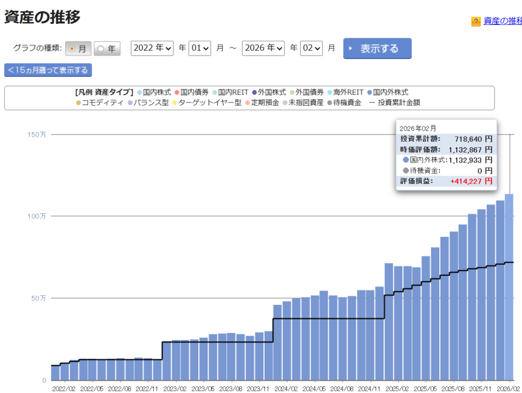 途中、少し横ばいになったり下がったりする時期もありますが、長期で積み立てることで元本の黒い線との差(含み益)がどんどん広がっていくのが実感できます。先月からの伸び幅も大きく、グラフを見るのが楽しい時期ですね😊