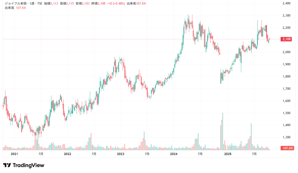 2024年の高値以降は下落局面に入りましたが、2025年に入って再び上昇基調に転じ、直近の高値圏を試す動きが見られます。