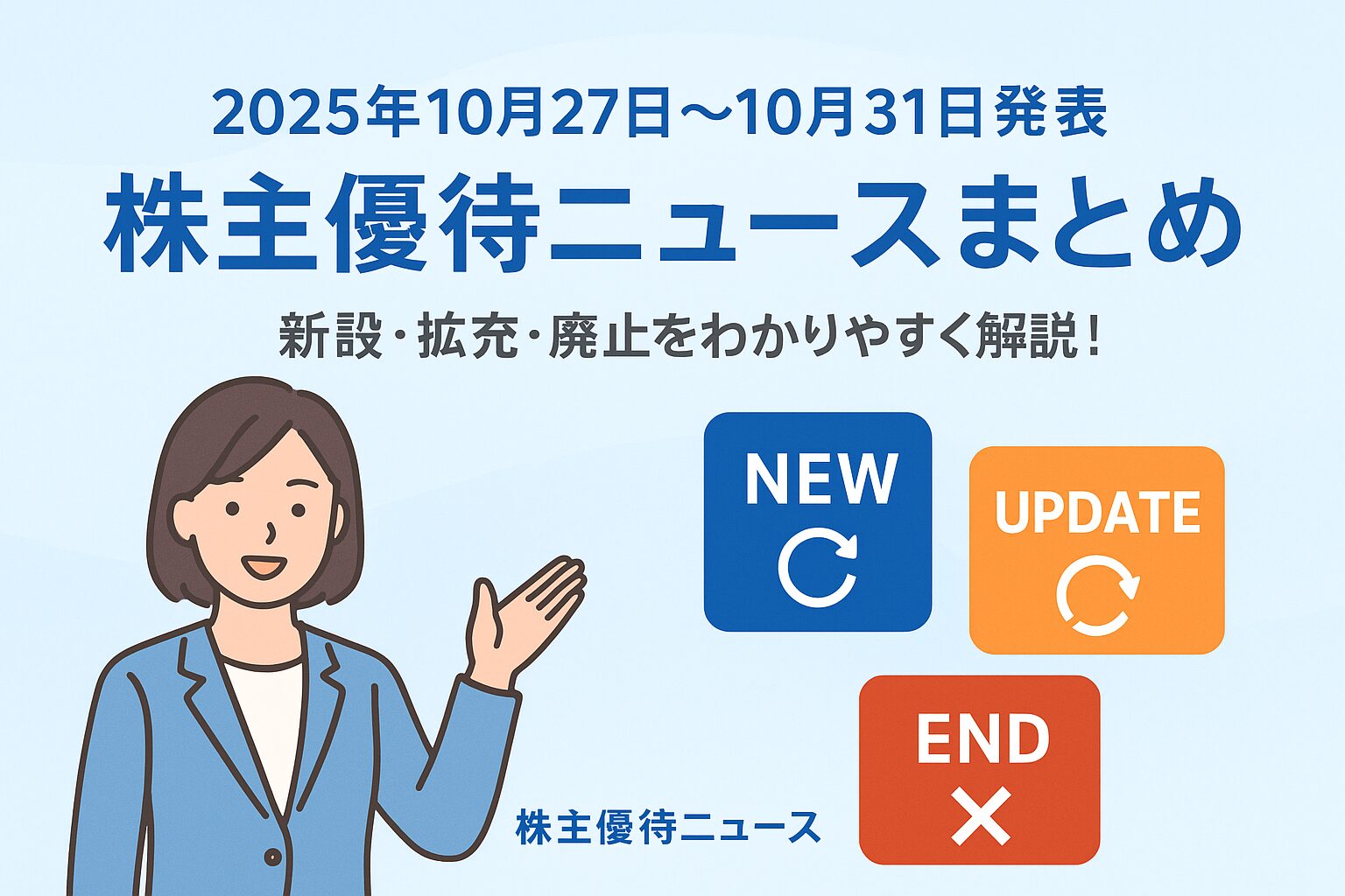 | 9658 ビジネスブレイン太田昭和 | 2025/10/31 | QUOカード | 2026年3月権利分から優待拡充。100株以上(1年超保有)では従来1,000円相当→3,000円相当に増額、300株以上(1年以上)では2,000円相当→5,000円相当に増額。 | 毎年3月末時点100株以上、継続保有1年以上 | 3月末 | 長期保有優遇を継続しつつ優待額を大幅アップ |