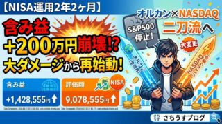 資産運用 【NISA運用2年3ヶ月】含み益200万円から急転直下!?💦大ダメージからの積立設定「大変更」を公開! 新NISA運用2年3ヶ月目のリアルな実績を公開!好調だった含み益200万円がついに崩壊!? 大下落相場を受けて、S&P500の積立を停止し「オルカン×NASDAQ」の二刀流へシフトした理由と、最新の銘柄別リターンを赤裸々に解説します。 2026.04.02 資産運用