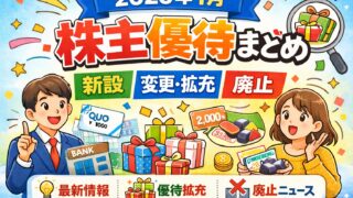 ニュース 【2026年1月版】株主優待の新設・変更・廃止まとめ|八十二長野銀行が初優待、銚子丸は大幅拡充! 2026年1月に発表された株主優待の新設・変更・廃止情報を一覧で解説。八十二長野銀行の初優待や銚子丸の大幅拡充、優待廃止と増配を発表した企業まで個人投資家向けに分かりやすくまとめました。 2026.01.18 ニュース株主優待