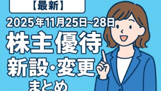 ニュース 【2025年11月17日〜21日】株主優待の新設・変更まとめ✨ 「2025年11月17日〜21日に発表された株主優待の新設・変更を一挙まとめ!少額で始めやすい優待や、長期保有者向けの変更、話題の仮想通貨優待など、最新情報を分かりやすく解説します。」 2025.11.24 ニュース株主優待