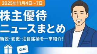 ニュース 2025年10月27日~31日【株主優待】新設・変更・廃止まとめ 2025年10月27日~31日に発表された株主優待情報をまとめました。新設・拡充・廃止の動きを一覧でわかりやすく解説!今週の注目銘柄や変更点をチェック! 2025.11.01 ニュース株主優待