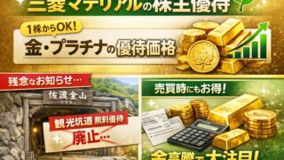 3月優待 【全株主対象】三菱マテリアルから株主優待が届いた!金の購入優待が魅力?💰中身と変更点を解説 「1株(端株)からでも優待がもらえる」という珍しい銘柄としても知られる三菱マテリアル(5711)🌱今回は、実際に届いた優待の内容や、以前と比べて変更になった点(観光坑道の無料券など)について、分かりやすく紹介していきます。1. 三菱マテリア... 2025.12.29 3月優待9月優待株主優待