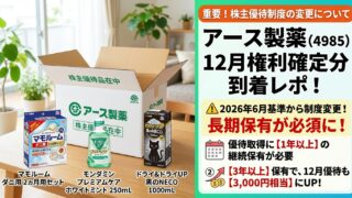 12月優待 アース製薬から優待到着!📦 12月確定分の中身公開と、知っておきたい「長期保有必須化」の注意点まとめ アース製薬から12月権利確定分の株主優待(2,000円相当の自社製品詰め合わせ)が到着!モンダミンやマモルームなど届いた中身をブログで紹介します。さらに、2026年6月から「1年以上の継続保有」が必須となる重要な制度変更についても詳しく解説。 2026.04.06 12月優待6月優待株主優待